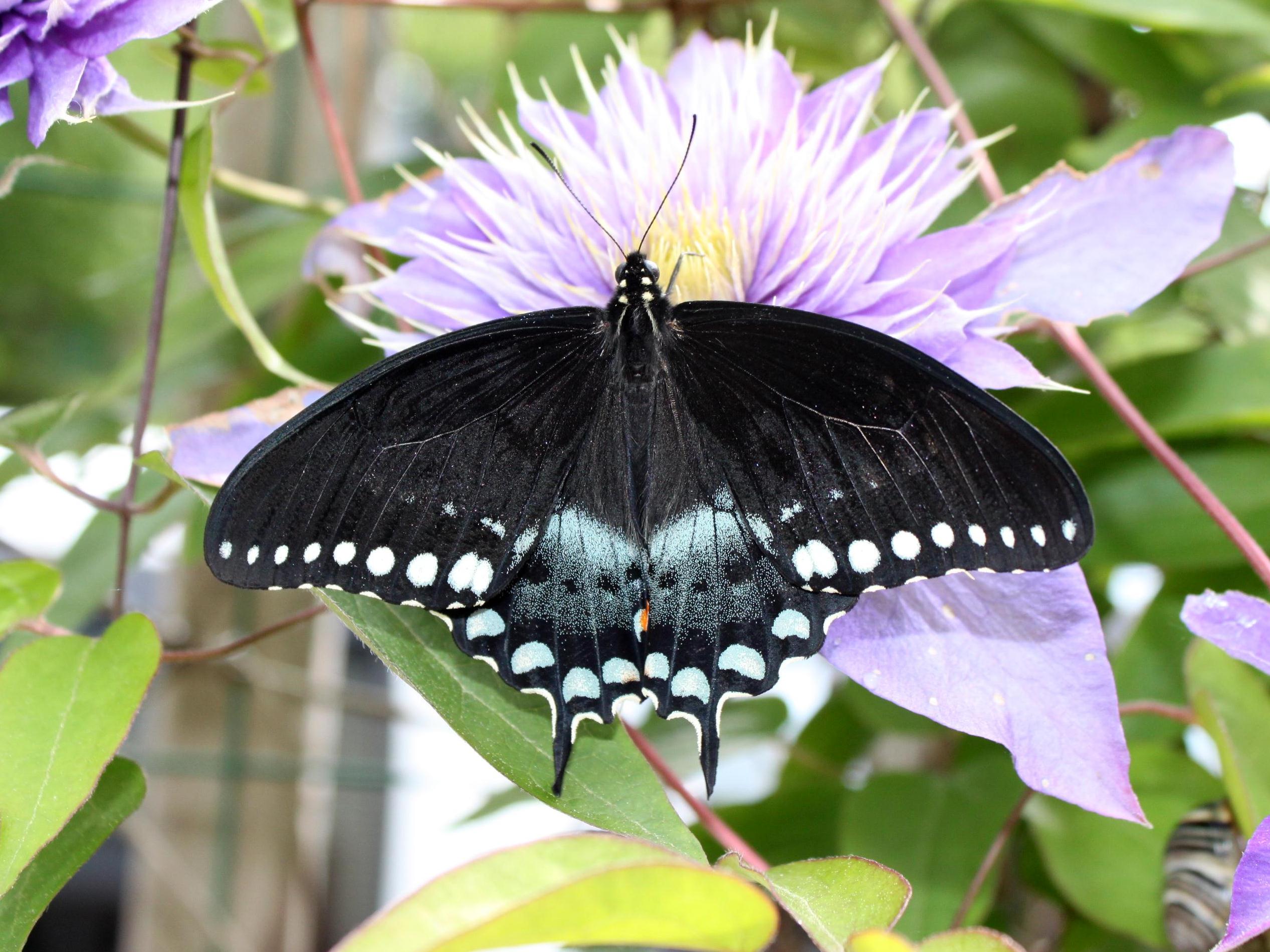 When I first saw it I wasn’t sure if I was actually looking at the Pipevine Swallowtail or not, as it does look very similar in size and color to both the Spicebush Swallowtail and the smaller Black Swallowtail (Papilio polyxenes), with one exception…when the sun hits the hind wings just right you get a bright flash of metallic blue (similar to the infamous Morpho butterflies of Brazil). I saw the flash and quickly realized that it was in fact a Pipevine Swallowtail and it was a female laying eggs. I did not capture her with my net…instead I just watched her flit around the vines depositing her eggs in clusters of anywhere from three to a dozen or more. I collected as many of the eggs as I could and spent the summer raising them. Once the adult butterflies hatched out 7-8 weeks later I then released the dozen or so that made it.