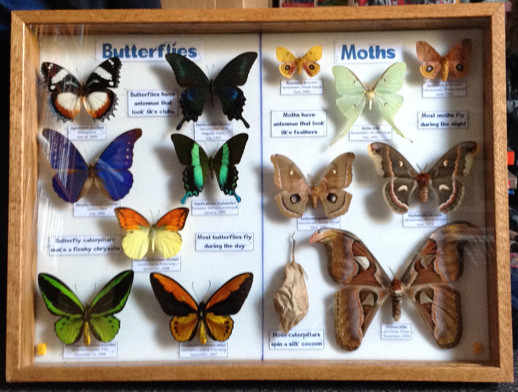 This is the 2nd new display I did, featuring a side-by-side comparison of some of the world’s prettiest butterflies as well as some amazing moth species. The moths actually get a great reaction from the students as most people think of small brown or white moths when the word moth is mentioned. A lot of people don’t realize that there are some really spectacular species of moths in the world, not only in size but in color. I also like the fact that, with the exception of the Atlas Moth (Attacus atlas) all of the moths shown are actually from Rhode Island, giving the kids a reason to open their eyes and to check out what might be in their own back yard!