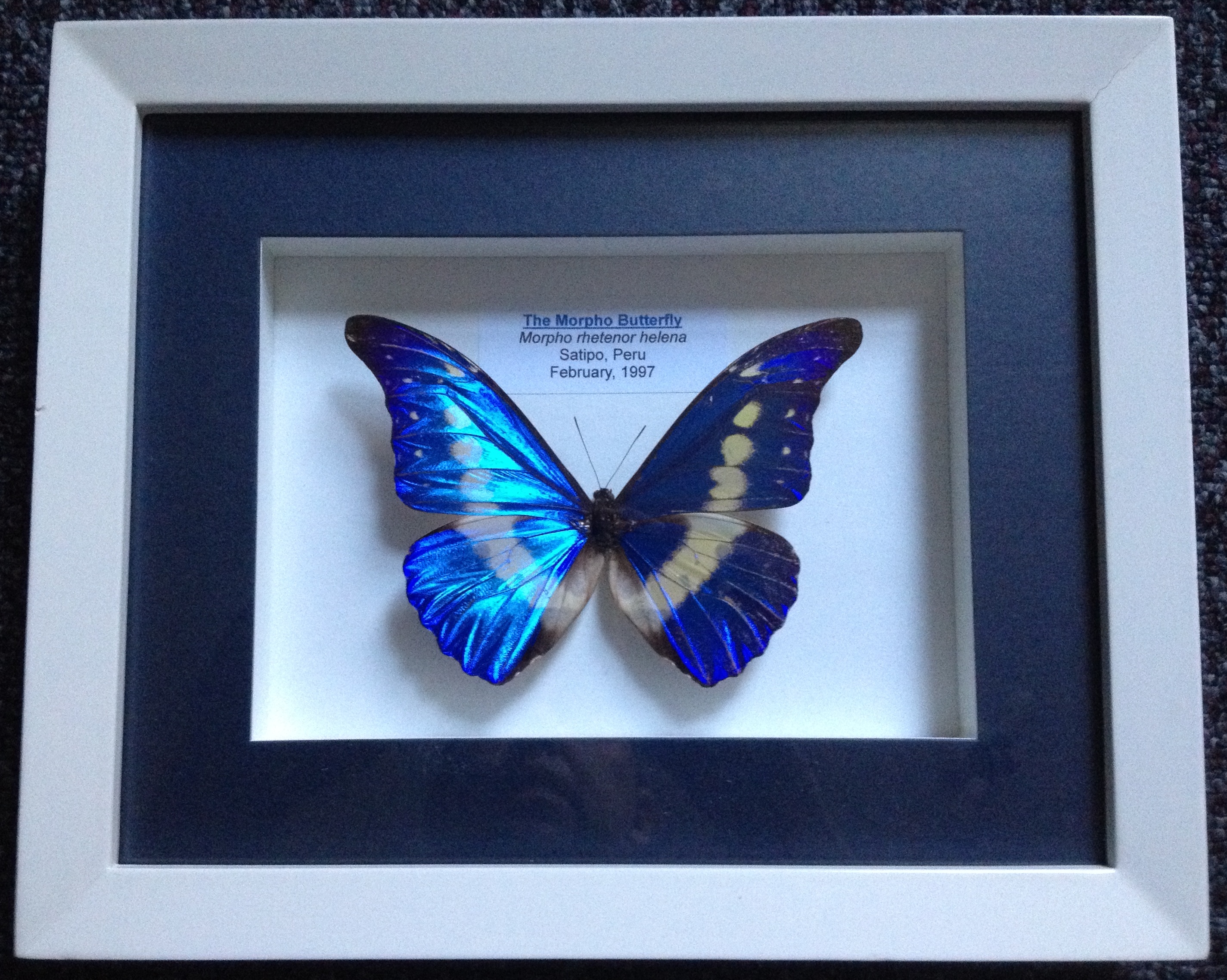 This is a smaller, 11″ x 9″, shadowbox display I did for a friend of mine. After seeing a portion of my collection she fell in love with the Morpho butterflies from Peru and Brazil and just needed one herself. So of course I chose to go with, in my opinion, the most spectacular of the Morpho butterflies, Morpho rhetenor helena!