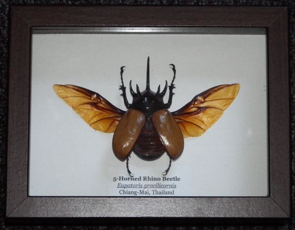 This beetle, one of the most popular of the rhino beetles, is displayed in a 5″ x 7″ shadowbox. Because these beetles are thick, the shadowbox needs to be deeper than the usual ones I use. This was a special order for a friend of mine, who wants to use it for a photography project.