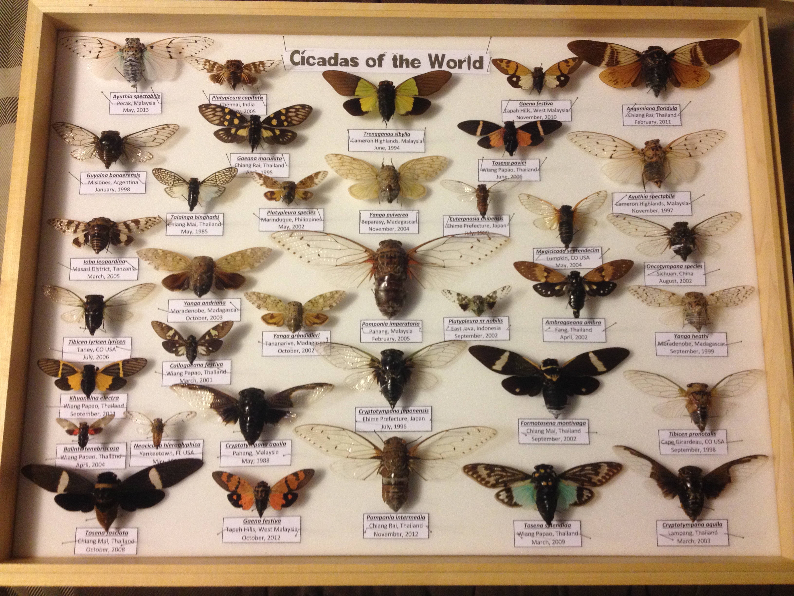 This custom display was done for a friend of mine. He is a huge fan of cicadas and though he already had a collection of the most readily available cicadas in smaller, individual shadowboxes he was looking for something more. He provided me with an idea of what he was looking for and I went all out for this display, featuring 36 of the world’s cicadas. In all honesty, I have never had so much fun putting a display together like this and it has inspired me a bit to do more displays, featuring a single family of insects.