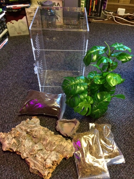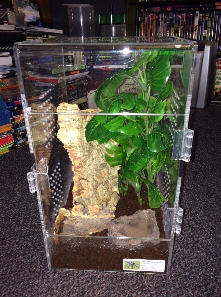 First off I needed an enclosure. Because Poecilotheria metallica is arboreal, you want an enclosure that is vertical in nature, providing height for which the tarantula to climb. Terrestrial tarantulas need a horizontal enclosure, providing more room to walk around on the ground. My immediate choice was the arboreal enclosure offered by Jamie’s Tarantulas, out of California. Let me just say that I cannot recommend buying from Jamie enough. Not only does she offer one of the best enclosures available on the market, but she also offers a great variety of live tarantulas, oftentimes not available from other dealers.