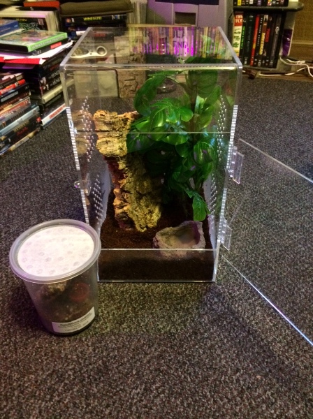 Next was transferring the tarantula. I wasn’t sure how it would go but it ended up being so easy that it seemed too good to be true. In the deli cup I had a piece of cork bark that the tarantula liked to hang out on. I carefully removed this and the tarantula stayed on it, very calmly. Then I slowly moved the whole piece of cork bark into the new enclosure without incident. Then it was just a matter of closing the door, latching it and putting the label on.