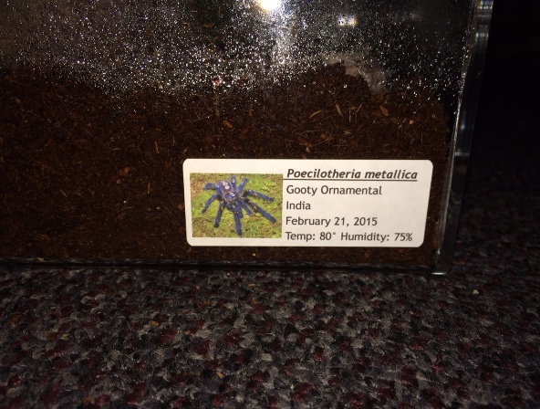 For labels I like to include certain information. I start with the scientific name and then add common name, locality (where it can be found), the date I received it and then minimum heating and humidity requirements. I just recently started adding a picture of the adult tarantula as well.