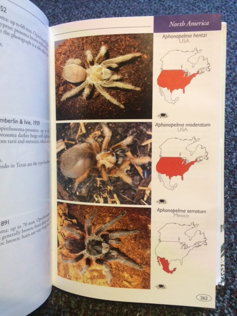 The book clocks in at just under five hundred pages, with almost half of it covering almost 300 species of tarantulas in full color. Each entry features a species description which includes size, coloration and markings. Then it goes into lifestyle, telling you whether the species is terrestrial, arboreal or burrowing. From there it goes into what kind of habitat it comes from and then distribution. A full color, full body shot of all species are also provided as well as a distribution map. The pictures are amazing and I really wish this book was slightly larger than its 5″ x 8″ size so that you could really appreciate them more.