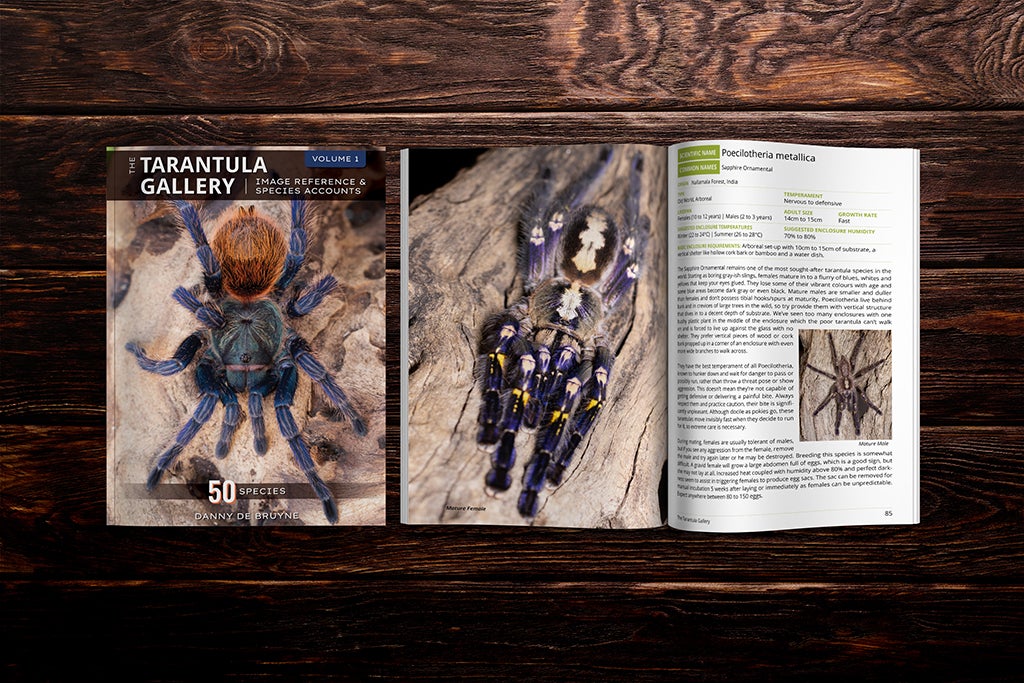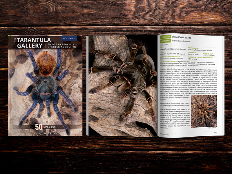 This is the first in a series of tarantula books with 50 Tarantula Species Accounts/50 Tarantula Care Guides in each volume. “The Tarantula Gallery” is a beautiful compilation of photographs and basic husbandry information compiled by avid South African tarantula hobbyist and tarantula breeder, Danny de Bruyne. A quick-reference for what each species looks like, listing basic requirements and suggestions to provide them with a comfortable enclosure in captivity.