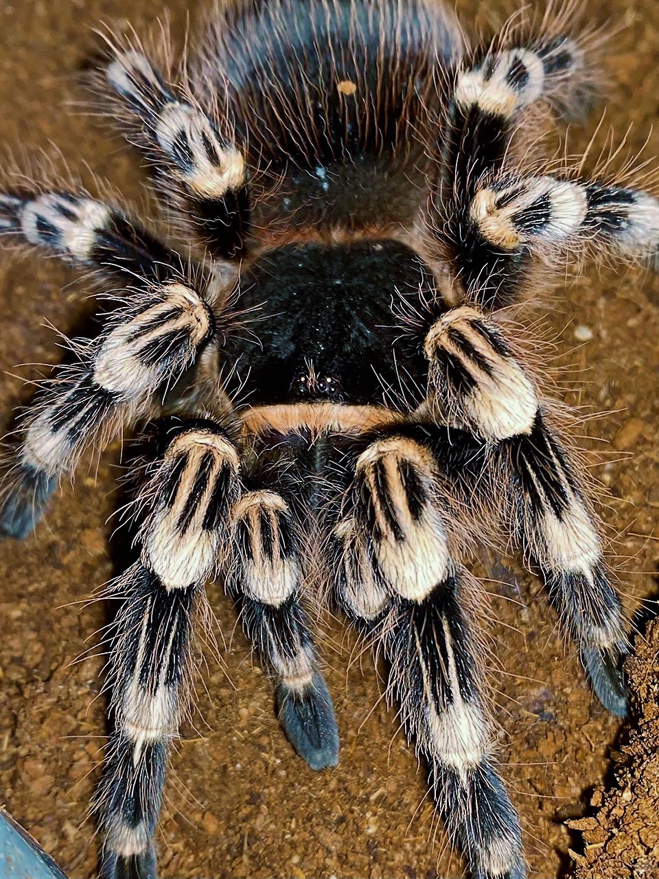 The colors of Acanthoscurria geniculata are absolutely stunning, especially with a new-molted specimen. The overall color is dark gray to black with white striping on all of the legs. Even the hairs on the legs are white, a beautiful contrast to the black parts of the legs. The abdomen is also dark, with pinkish hairs.