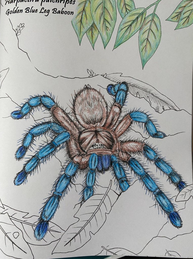 “The Old World Tarantula Coloring Book” arrived quickly, and Laura even included some fun extras like a bookmark, some stickers and even a magnet. Flipping through the pages, I became very excited to start on the first image, Harpactira pulchripes, the Golden Blue Leg Baboon.