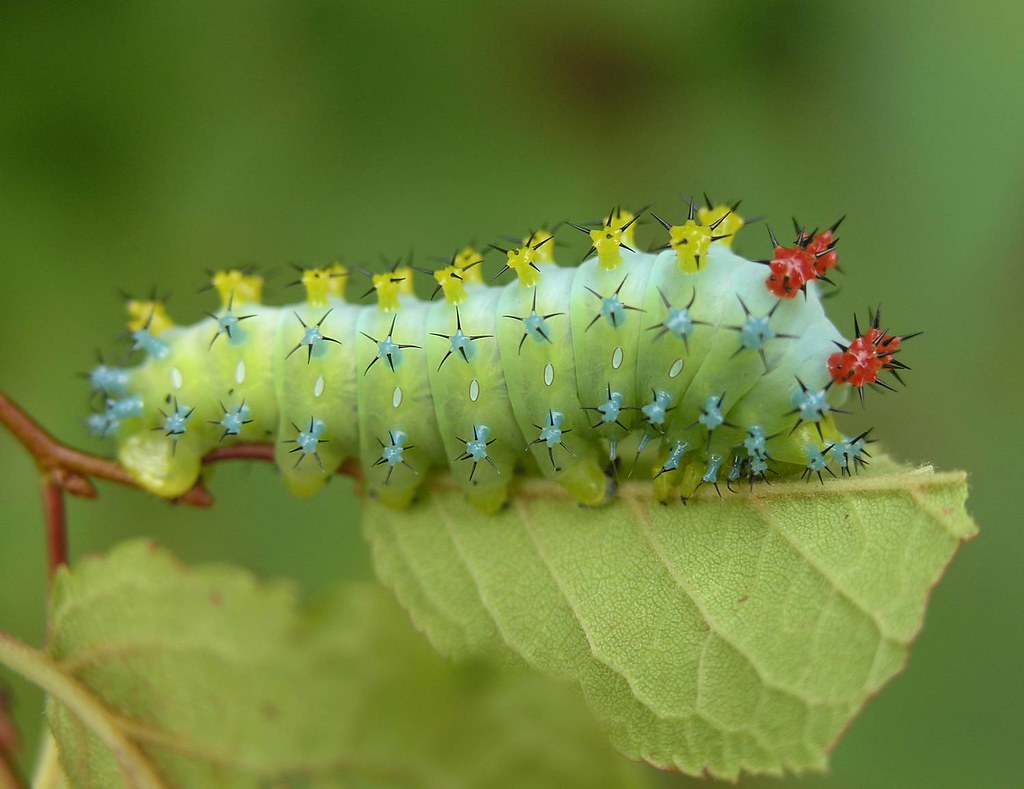 The life cycle of the Io moth begins when females lay clusters of eggs on the leaves of various host plants, such as willow, hackberry, and cherry trees. The caterpillars are equally striking, initially bright green and covered with tufts of venomous spines that can cause a painful sting if touched. As they mature, the caterpillars develop red and white lateral stripes along their bodies. These spines serve as a potent defense against predators, making the caterpillars less likely to be eaten.