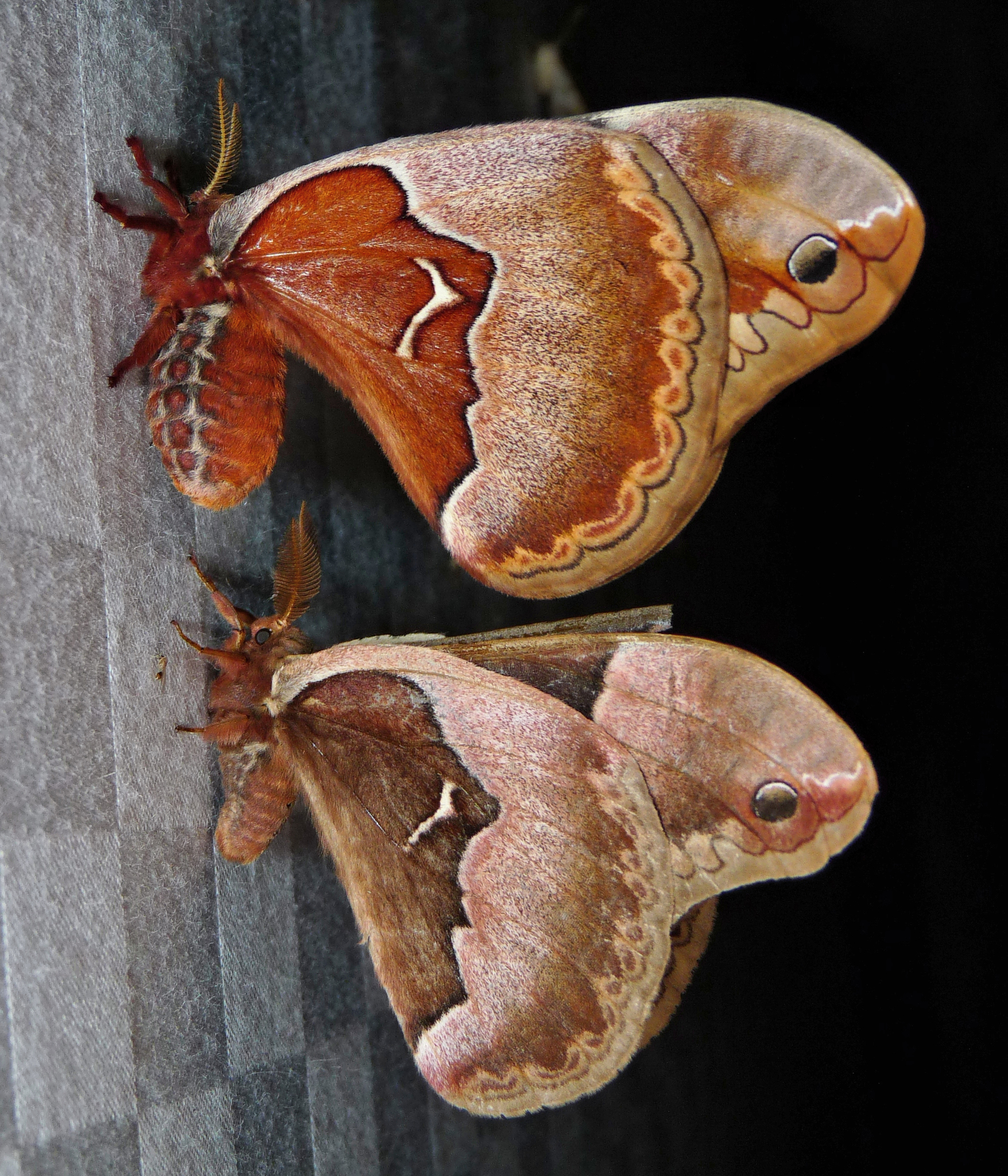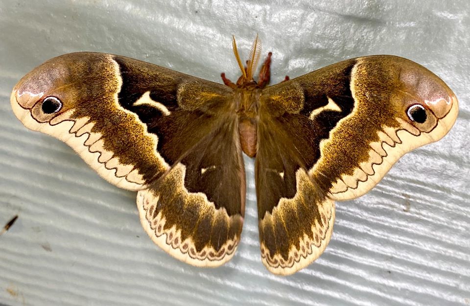 Adult Moth: Depending on the geographic location, Callosamia angulifera may have one or two broods per year. In the northern part of its range, a single brood flies from June to August. Further south, two broods emerge, one in March-April and another in August. The adult moths are nocturnal and, like other silkmoths, do not feed, as they lack functional mouthparts. Their sole purpose is reproduction. Males are attracted to females by pheromones released into the night air, and mating typically occurs between dusk and midnight. The adult lifespan is relatively short, usually lasting only about a week.