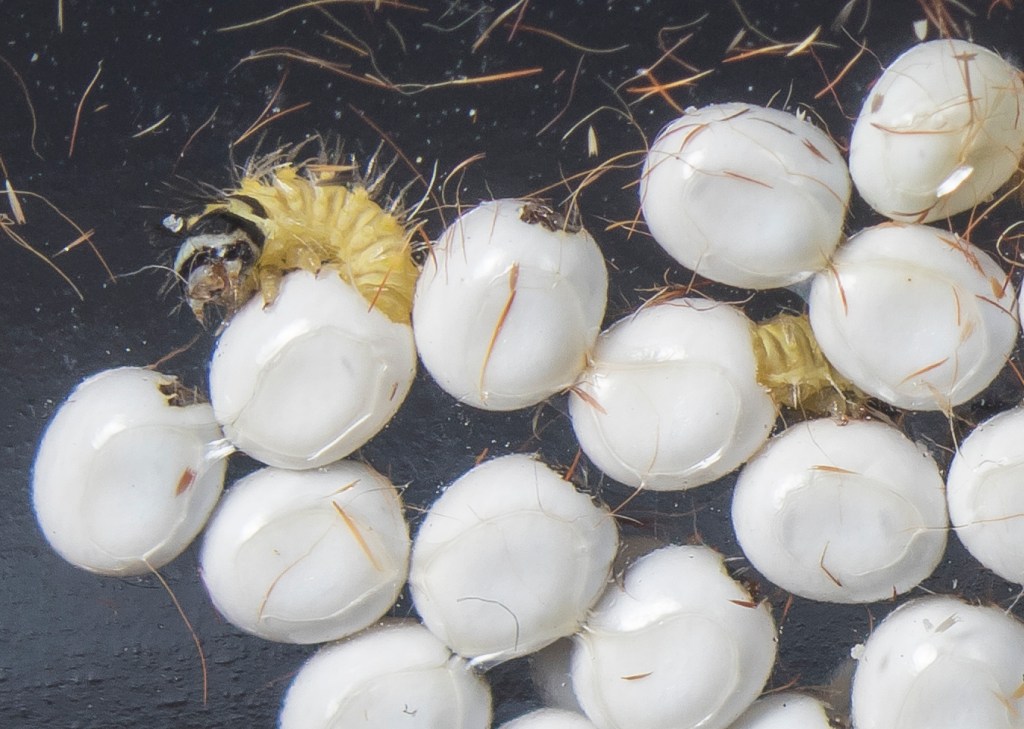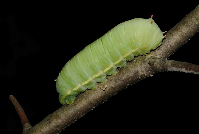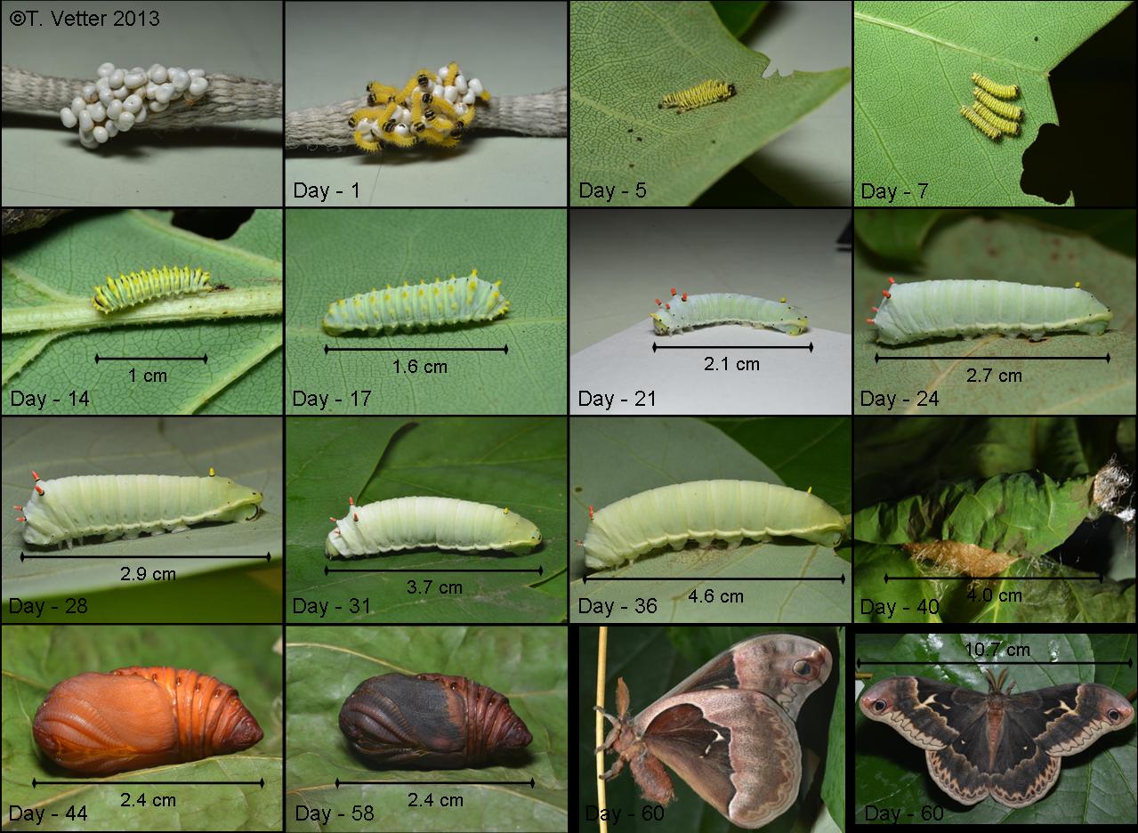 Egg: Mating typically occurs between dusk and midnight, with peak activity around 10 PM. The following evening at dusk, the female moth lays her eggs in neat rows of 4 to 10 on the leaves of tulip trees. These small eggs hatch in approximately one week, giving rise to the larval stage.
