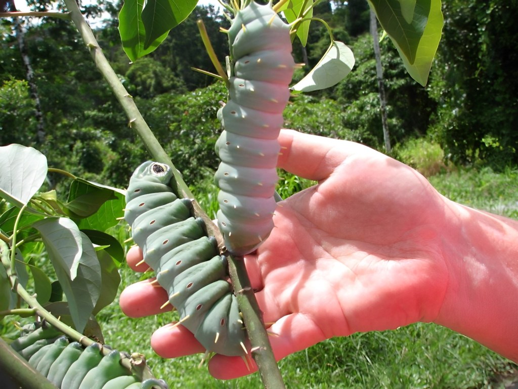 The larvae of Coscinocera hercules are also quite substantial, growing up to 12 cm in length. By the time they reach their final instar, they can weigh around 54 grams. These larvae exhibit a pale blue or green coloration and are characterized by red spots along their sides and prominent yellow spines. In terms of their diet, the larvae are polyphagous, consuming the leaves of a variety of rainforest trees. These food plants include Dysoxylum mollissimum, Glochidion ferdinandi, Homalanthus populifolius, Polyscias elegans, Timonius rumphii, and Timonius singularis.