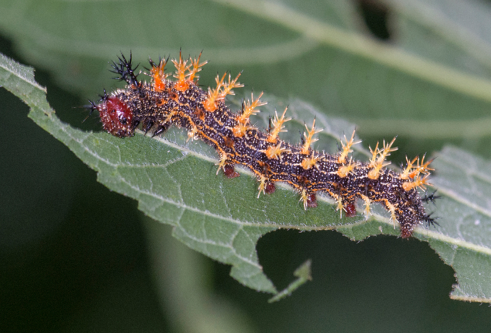 - Larva (Caterpillar): The caterpillars of the question mark are somewhat spiny and can vary in color, often exhibiting shades of brown, black, and yellow or green. They possess branched scoli (fleshy projections) along their bodies. A fascinating defensive behavior is their ability to create a shelter by folding over and silking together a leaf of their host plant.