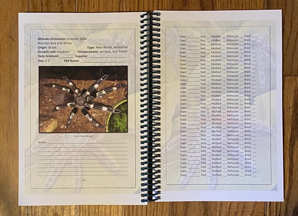 “I love my new book! It’s amazing quality and a wonderful tool for tarantula keeping. My only complaint is that most of the tarantula’s I keep (Antilles PinkToe, Panama Blonde, etc.) are not in the book so I’ve had to make a few adjustments there. Other than that, it’s an amazing purchase and I highly recommend it!“