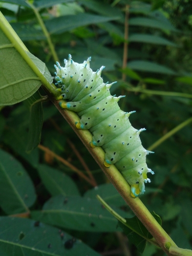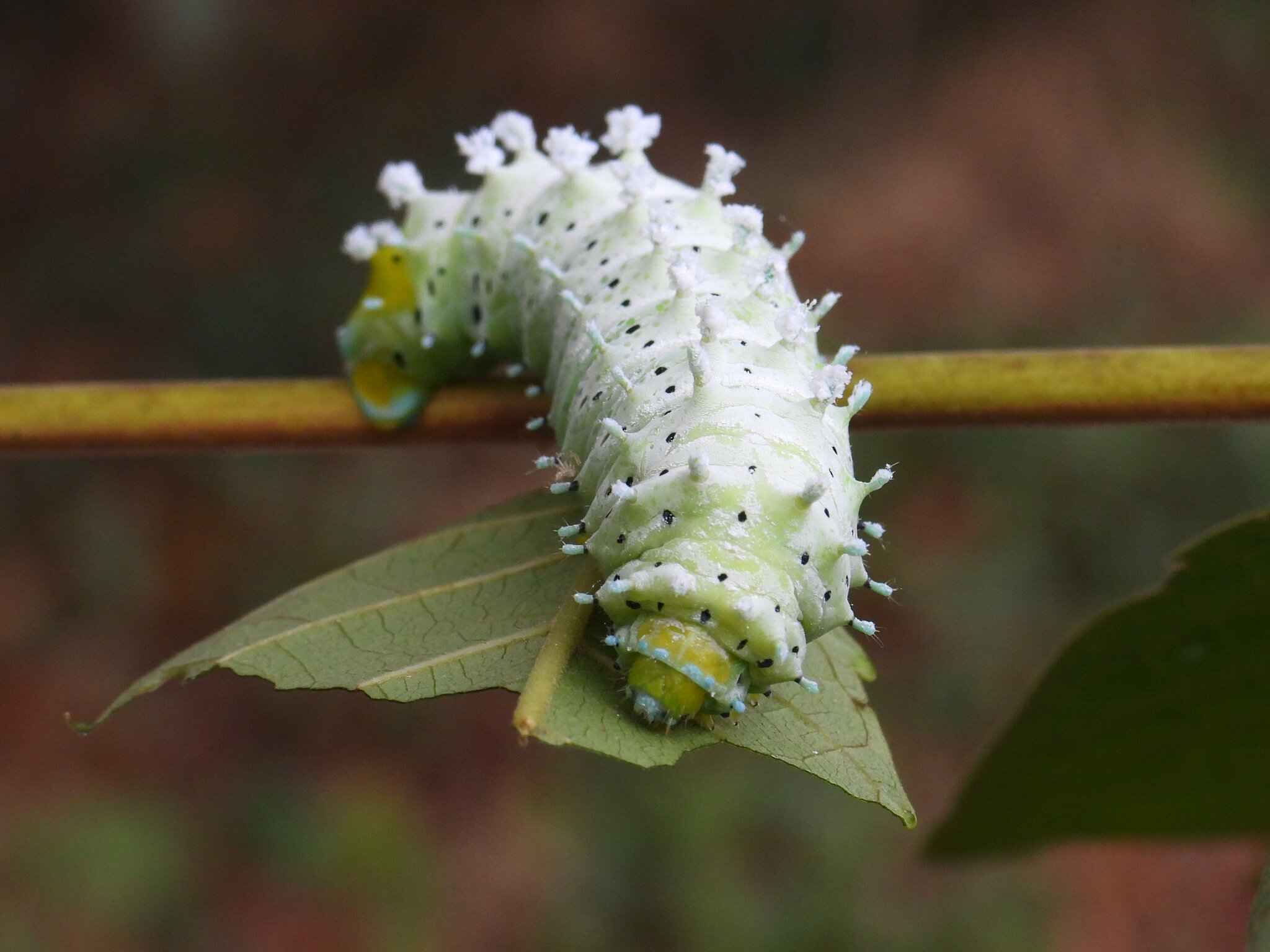 - Larva (Caterpillar): The larvae are large and striking caterpillars that go through several instars. Young larvae are often yellowish-green with black markings. As they mature, they become a vibrant bluish-green with a powdery white coating and prominent black spots or stripes. They feed voraciously on the leaves of Ailanthus trees, growing rapidly. Unlike some other silk moths, the larvae feed openly and do not spin a tight cocoon for pupation.