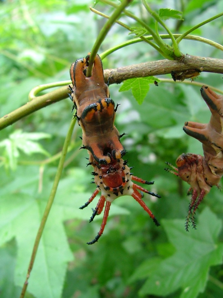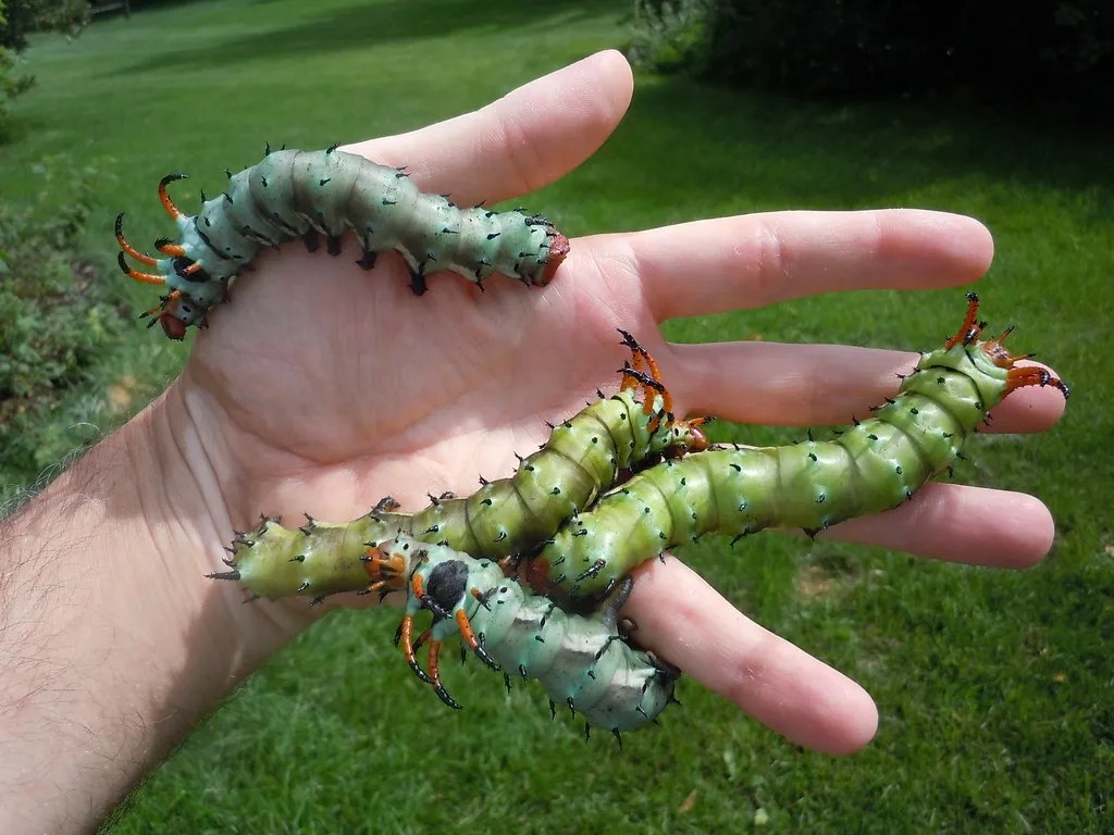 - Larva (Caterpillar): The larvae are famously known as “hickory horned devils.” They are among the largest caterpillars in North America, reaching up to 5-6 inches (13-15 cm) in length when fully grown. Early instars are smaller and often resemble bird droppings. As they mature, they become a vibrant green, with large, orange, horn-like projections (scoli) on their thoracic segments, and smaller black-tipped spines along their bodies. Despite their intimidating appearance, these “horns” are harmless and are simply a defense mechanism to deter predators. They are voracious feeders and can consume a significant amount of foliage.