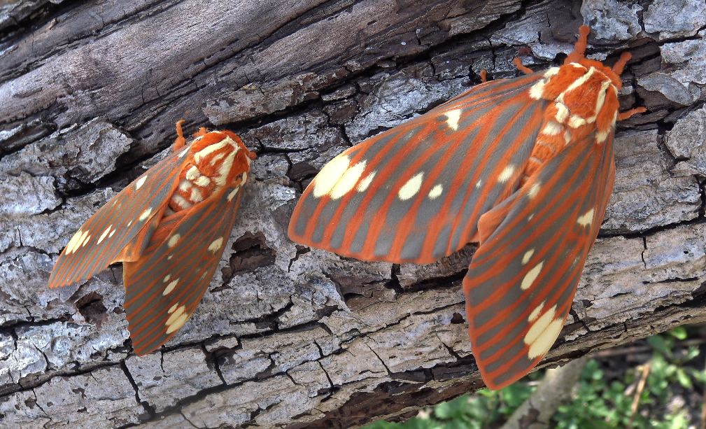 The regal moth is a truly colossal insect, boasting a wingspan that can range from 4 to 6 inches (10 to 15 cm), with some exceptionally large females reaching up to 7 inches. Its wings are a striking blend of orange, yellowish-orange, and black, forming a bold and intricate pattern. The forewings are typically a deep olive-brown or black with prominent yellow or orange spots and veins. The hindwings are often more uniformly orange or yellow with a distinctive black border and a series of smaller black spots.