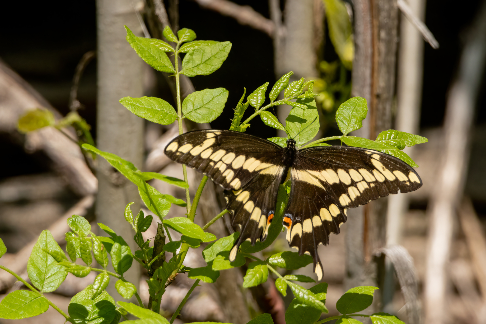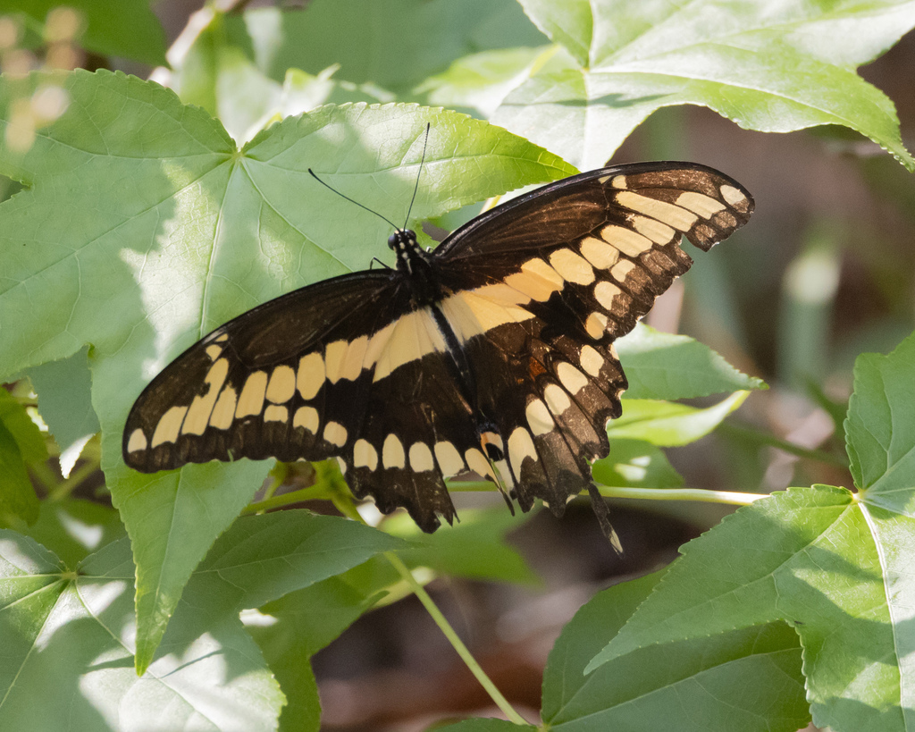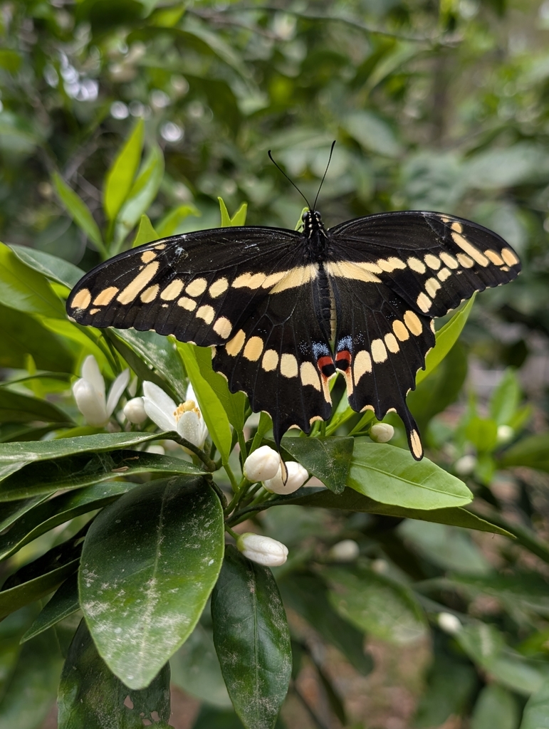 Giant swallowtails are known for their strong, rapid, and somewhat erratic flight, often soaring high above the ground. Males are frequently observed patrolling open areas or near host plants in search of receptive females.