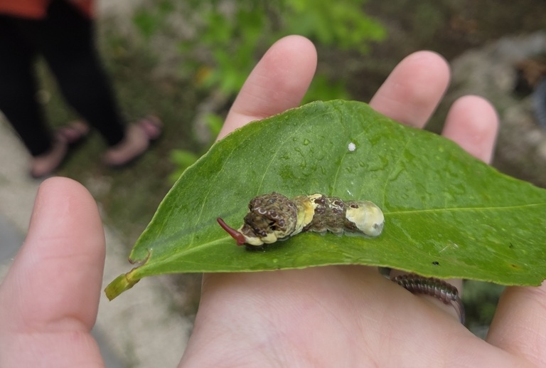 - Larva (Caterpillar): The newly hatched larvae are small and brownish-black, strikingly resembling bird droppings – an effective camouflage against predators. As they grow through successive instars, they retain this “bird dropping” mimicry, becoming larger and more variegated with splotches of white, brown, and black. They are stout and fleshy, with a rough texture. When threatened, like other swallowtail caterpillars, they possess a fleshy, forked orange gland called the osmeterium, which they can evert from behind their head, releasing a foul-smelling, citrus-scented substance to deter attackers. These larvae are known as “orange dogs” due to their preference for citrus trees.