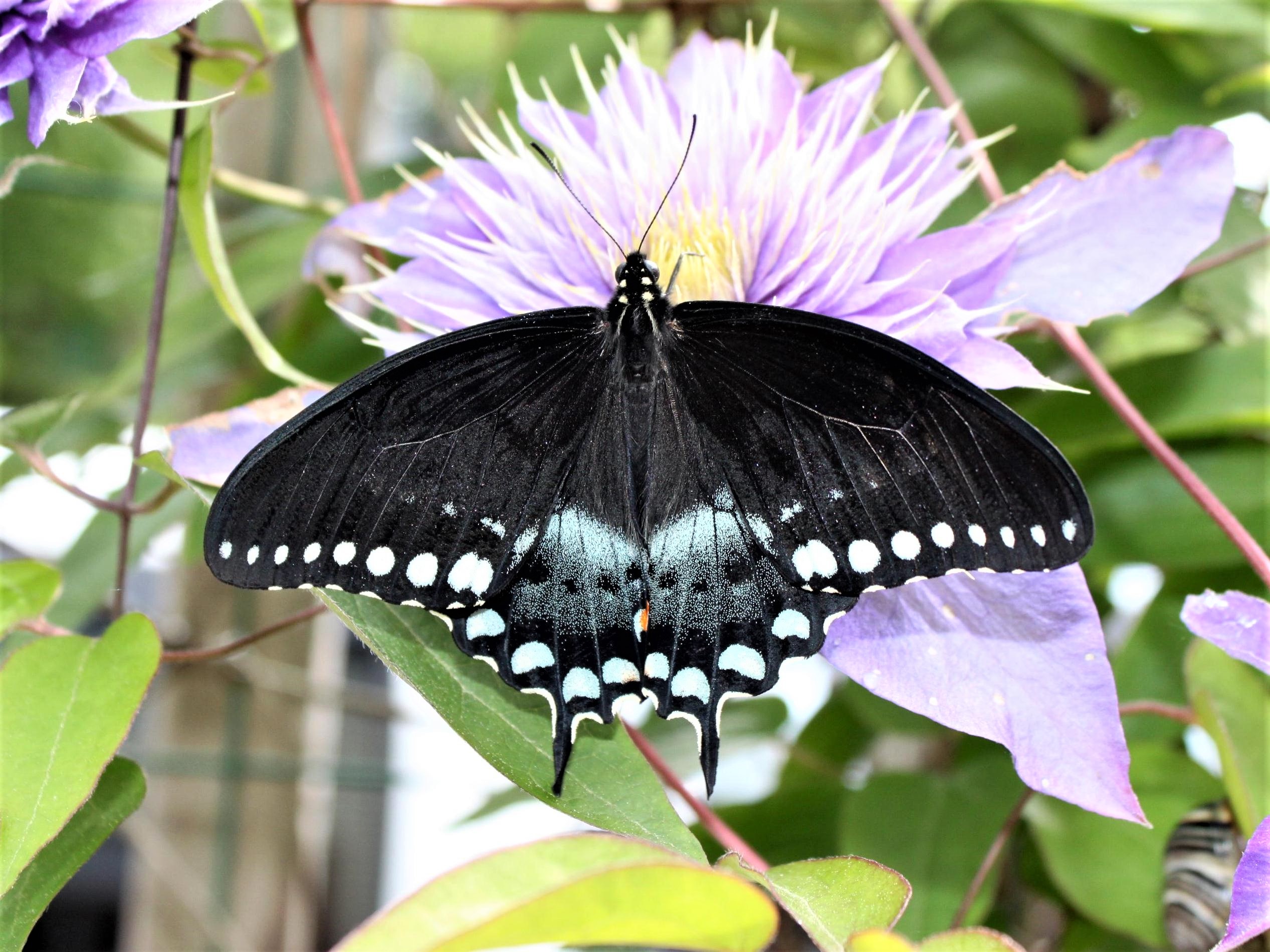 The spicebush swallowtail is a medium to large butterfly, typically boasting a wingspan of 3 to 4.5 inches (7.6 to 11.4 cm). The dorsal (upper) surface of its wings is predominantly a rich, velvety black or dark brownish-black. This dark background serves as a dramatic canvas for the species’ most captivating feature: a shimmering band of iridescent blue or blue-green scales on the hindwings, particularly prominent in males. Females often exhibit a more subdued blue iridescence or a row of distinct blue spots.