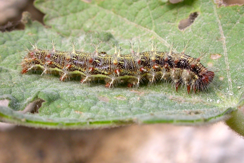 - Larva (Caterpillar): The caterpillars are typically dark-colored (black or brownish) with numerous branched spines covering their bodies. They often have yellowish stripes or spots along their sides. They are solitary feeders, each creating a silk web shelter by folding or tying together leaves of their host plant, within which they feed and develop.