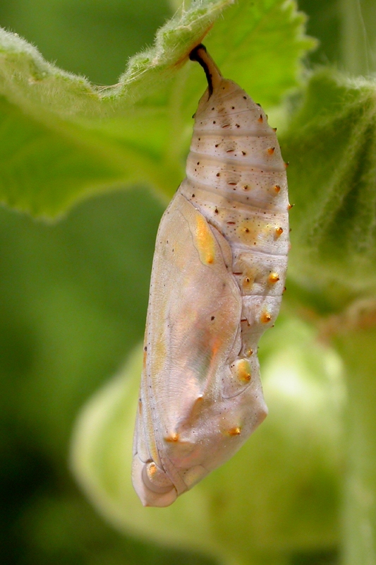 - Pupa (Chrysalis): Once fully grown, the larva forms a chrysalis that is usually light brown, green, or mottled, often adorned with metallic gold or silver spots. It is suspended head down from a silken pad on a leaf or stem.
