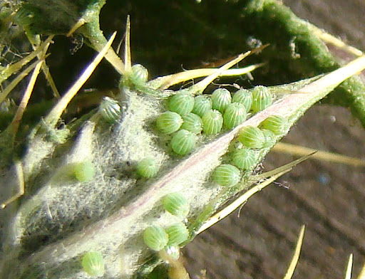 - Egg: Females lay small, pale green, ribbed eggs singly on the upper surface of the leaves of its host plants.