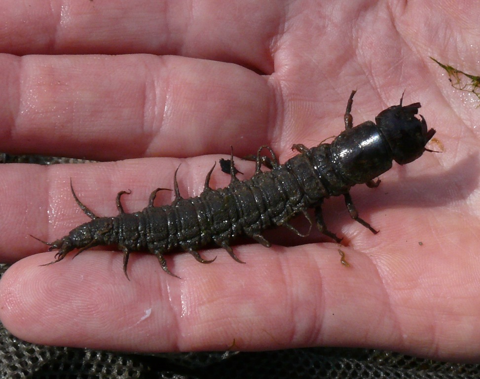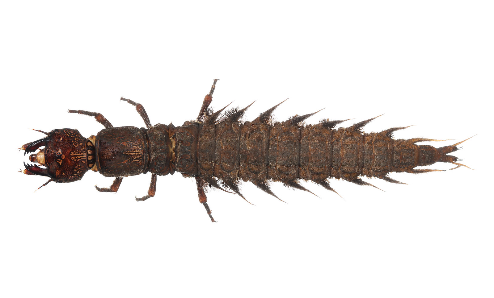 - Larva (Hellgrammite): The larval stage, known as the “hellgrammite,” is equally impressive, reaching lengths of up to 3 inches (7.5 cm). Hellgrammites are dark, segmented, and flattened, with powerful biting mandibles. They possess seven or eight pairs of prominent, branched abdominal gills along their sides, used for respiration underwater, and two fleshy anal prolegs with hooks at the end for gripping the substrate. Their intimidating appearance and powerful jaws are well-deserved, as they are active aquatic predators.