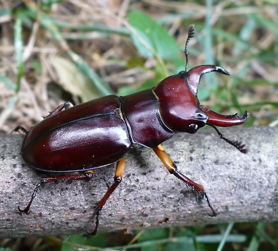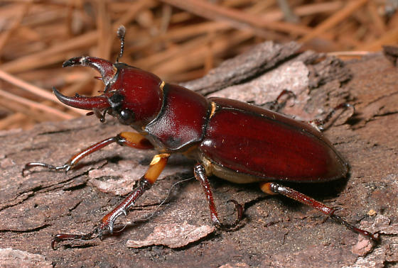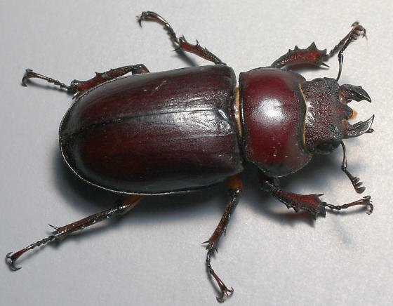 Lucanus capreolus is a medium to large-sized beetle, typically ranging from 1 to 2.5 inches (2.5 to 6.3 cm) in length. Its most striking feature is its overall coloration, which is a uniform, glossy reddish-brown or mahogany, earning it its common name.