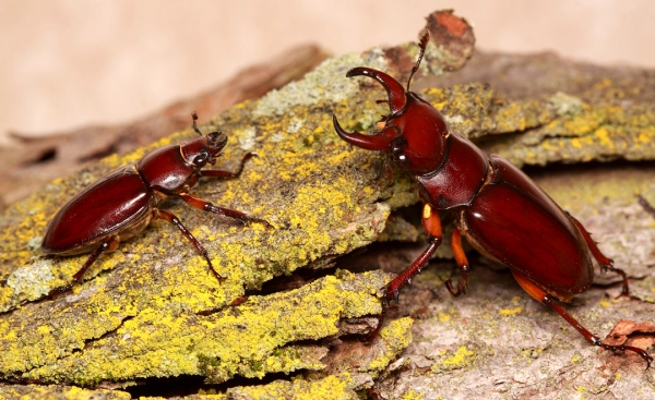 - Male: Males are easily distinguished by their prominent, enlarged mandibles, which are often described as resembling the antlers of a deer. While impressive, these mandibles are generally smooth, somewhat curved, and less branched or toothed compared to some other Lucanus species (like Lucanus elaphus). They are primarily used for wrestling with other males for mating rights or in territorial displays.