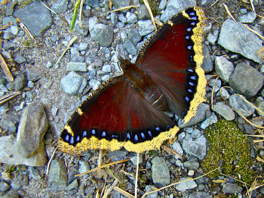The mourning cloak is a large butterfly, typically boasting a wingspan ranging from 2.5 to 4 inches (6.4 to 10 cm). Its dorsal (upper) wing surface features a rich, velvety dark maroon or purplish-brown background. The most striking feature is a broad, irregular pale yellow or cream border along the outer margin of all four wings. Just inside this yellow border, there is a row of iridescent blue spots. The forewings display two slightly darker, indistinct spots near the leading edge, while the hindwings are mostly dark with the same yellow border and blue spots.