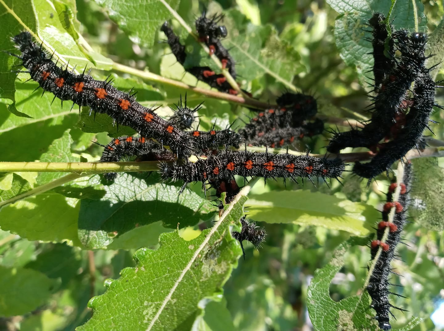 - Larva (Caterpillar): The caterpillars are typically black with numerous branched spines covering their bodies. They have a row of red spots along their backs and often have smaller white spots. They are gregarious feeders, often found in large groups, sometimes defoliating entire branches of their host trees. They create silk mats on the leaves where they feed and rest.