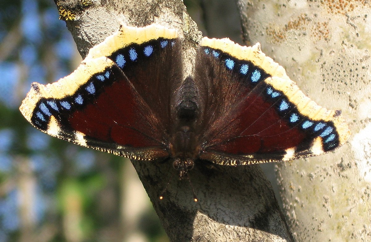 The mourning cloak is a large butterfly, typically boasting a wingspan ranging from 2.5 to 4 inches (6.4 to 10 cm). Its dorsal (upper) wing surface features a rich, velvety dark maroon or purplish-brown background. The most striking feature is a broad, irregular pale yellow or cream border along the outer margin of all four wings. Just inside this yellow border, there is a row of iridescent blue spots. The forewings display two slightly darker, indistinct spots near the leading edge, while the hindwings are mostly dark with the same yellow border and blue spots.