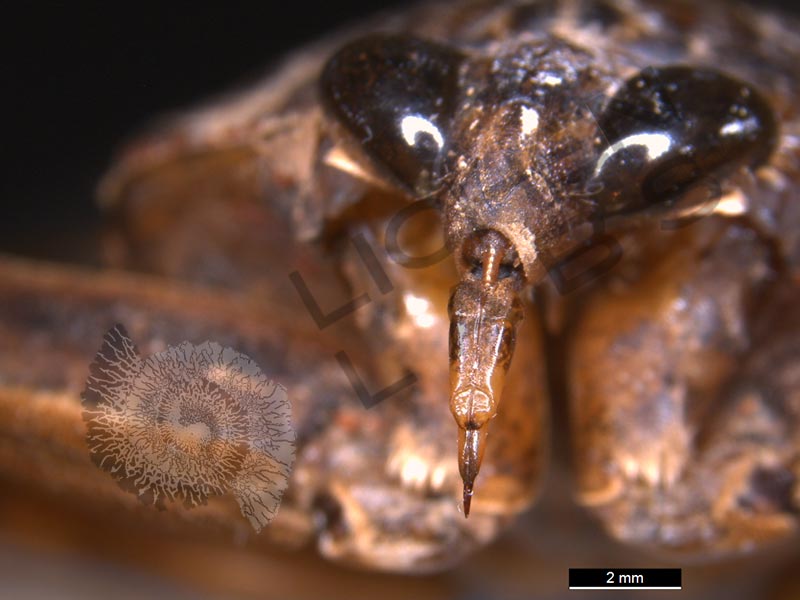 The head is small and triangular, with large, compound eyes. The most crucial part of its feeding apparatus is a sharp, stout proboscis (beak) that it uses to inject a powerful digestive saliva into its prey. There is little significant sexual dimorphism, with males and females appearing very similar.