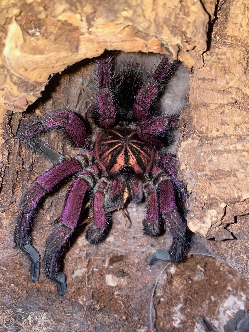 Male: Mature males undergo a spectacular transformation with their final molt. They develop a stunning iridescent coloration that is a hallmark of the Pamphobeteus genus. Their legs and carapace shimmer with hues of brilliant purple, blue, and sometimes magenta, creating a truly magnificent display of color. This coloration is most vibrant under natural light or a bright flash. Mature males are also typically more slender than females.