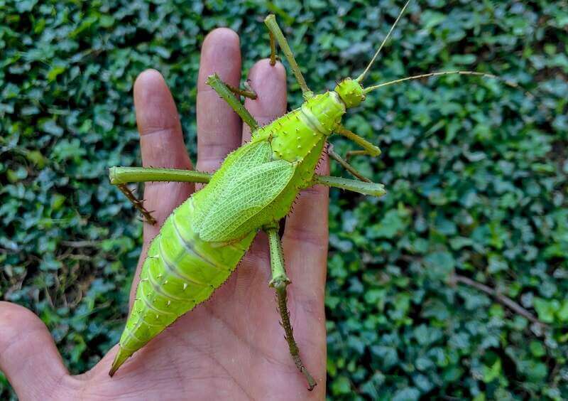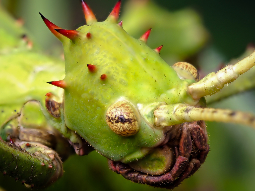 Female: Adult females are the most imposing members of the species. Their bodies are broad and flattened, covered in a textured, often moss-like pattern of vibrant lime green, yellowish-green, or brownish-green. This coloration and texture allows them to blend in seamlessly with the foliage of their habitat. Their wings are very small and non-functional, a testament to their heavy build. The most striking feature of the female is her massive, spiny legs and a series of large, thorny spines along her body, which serve as a formidable defense.
