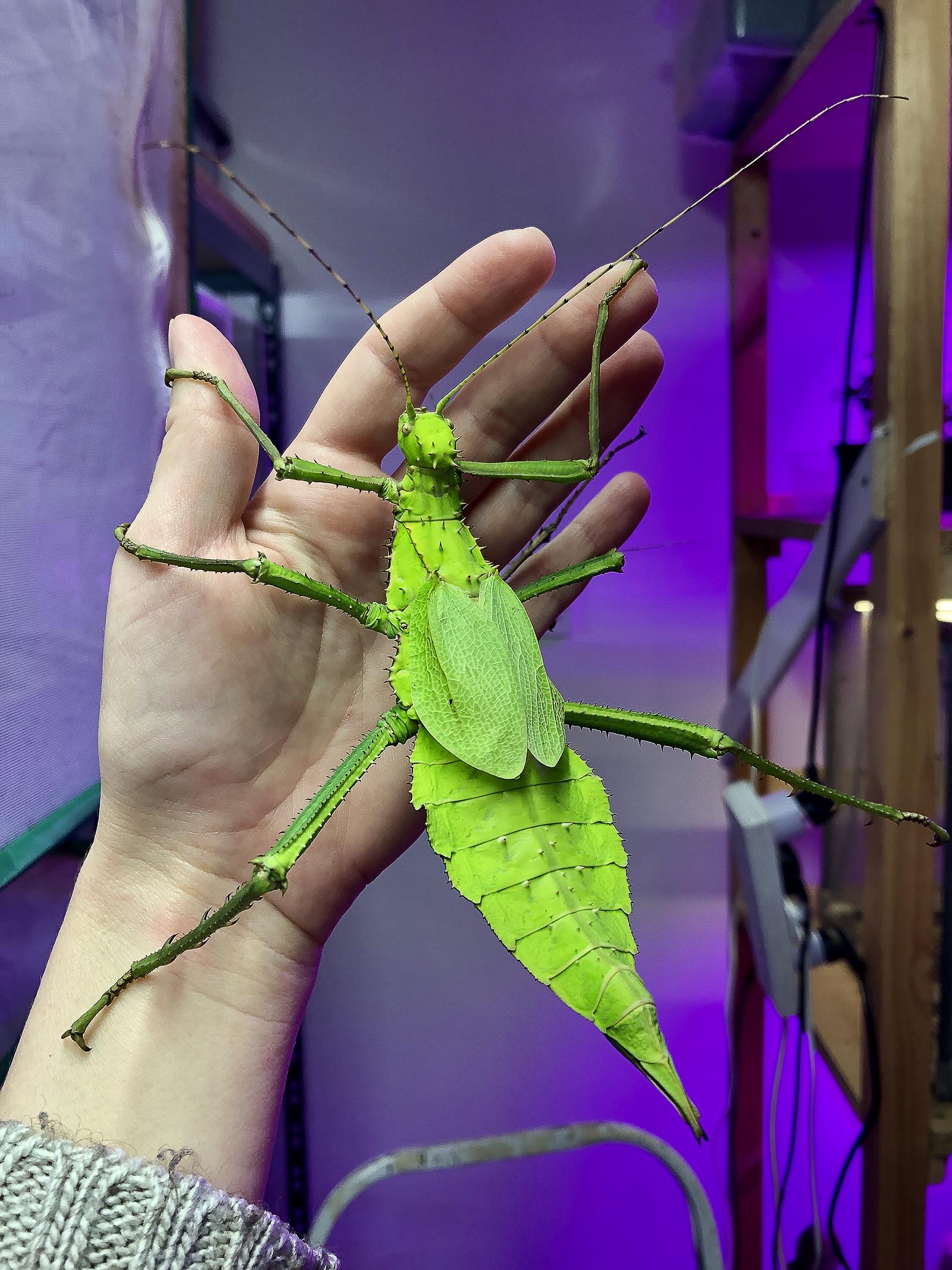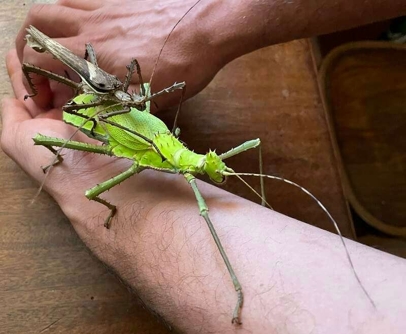 Temperament: When disturbed or handled carelessly, a Jungle Nymph will use its impressive size and spiny legs to its advantage. They can rear up on their hind legs and use their spiny middle and front legs to pinch anything that is bothering them. The female’s pinch is particularly powerful and can be quite painful. They also have the ability to “stridulate,” or make a loud, hissing sound by rubbing their wings together, which is intended to startle and deter predators.