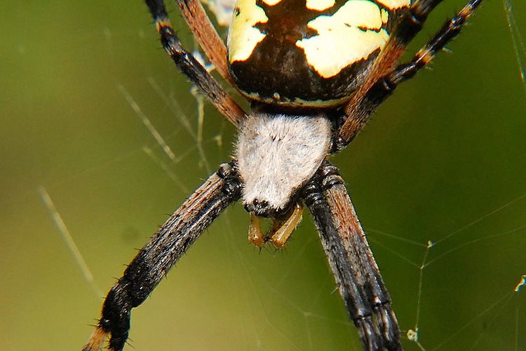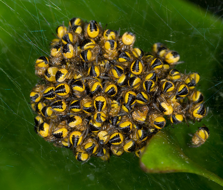 Female: The female is the centerpiece of the species. Her opisthosoma (abdomen) is the most striking feature, being large, oval, and covered in a highly contrasting pattern of brilliant yellow and black. The pattern often consists of vertical yellow stripes or spots on a black background. Her cephalothorax is covered in dense, silvery-white or grey hairs, giving it a metallic sheen. The legs are generally black, often with bands of yellow or red near the joints. These vibrant colors are a form of aposematism, serving as a warning to potential predators that the spider is potentially toxic or distasteful.