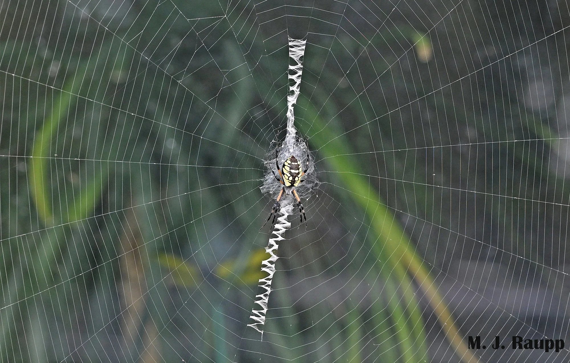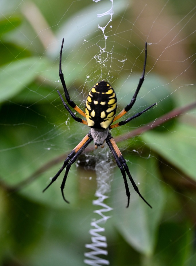 The Stabilimentum (Writing): This is the dense, zigzag pattern of non-sticky silk spun directly through the center of the web. It is what gives the spider its common name, “Writing Spider.” The exact purpose of the stabilimentum is debated, but theories suggest it may: