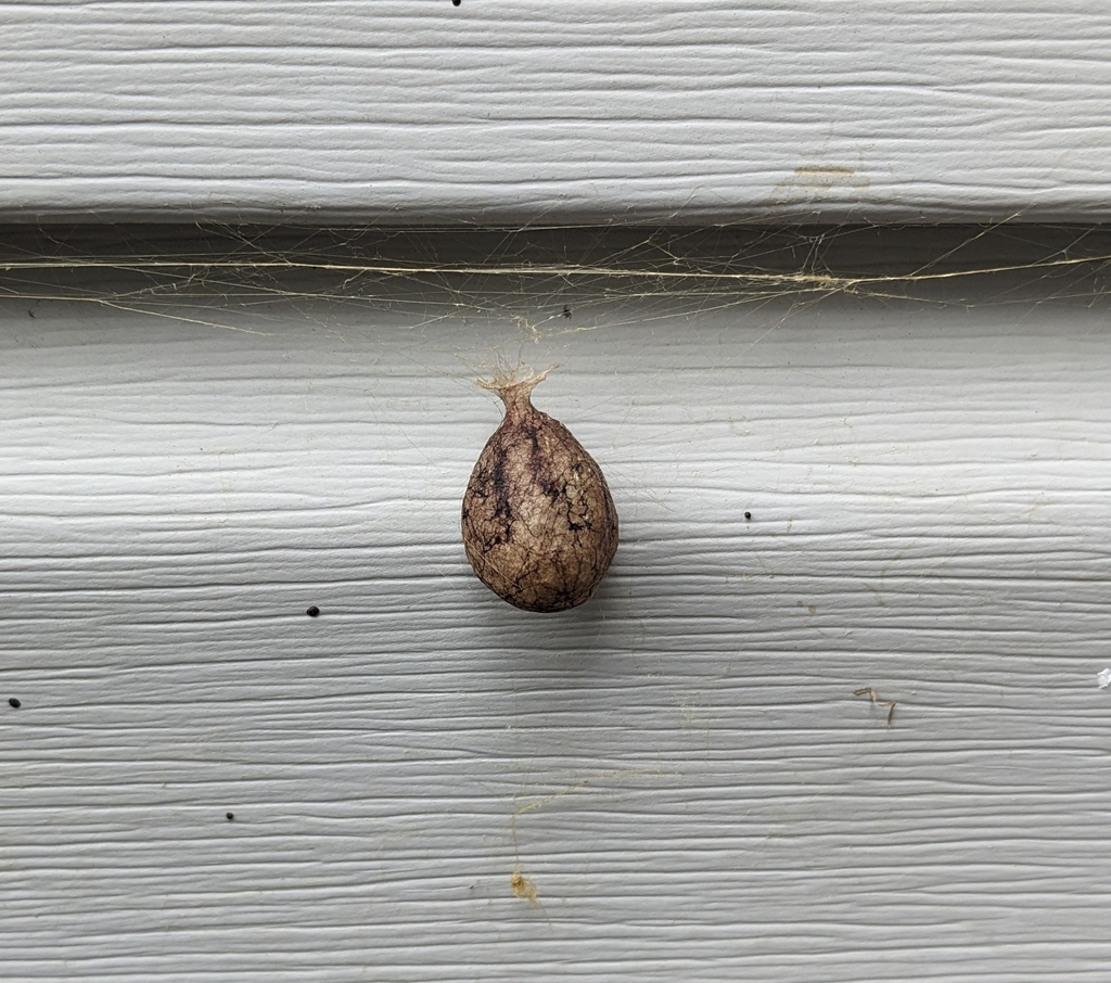 Egg: In late summer or early fall, the female produces one or more egg sacs. These are large (about 1 inch wide), brown, papery, and teardrop-shaped, containing hundreds of eggs. She attaches the sac to a nearby branch or structure, providing protection over the winter. The female typically dies shortly after producing the last egg sac, often with the first hard frost.