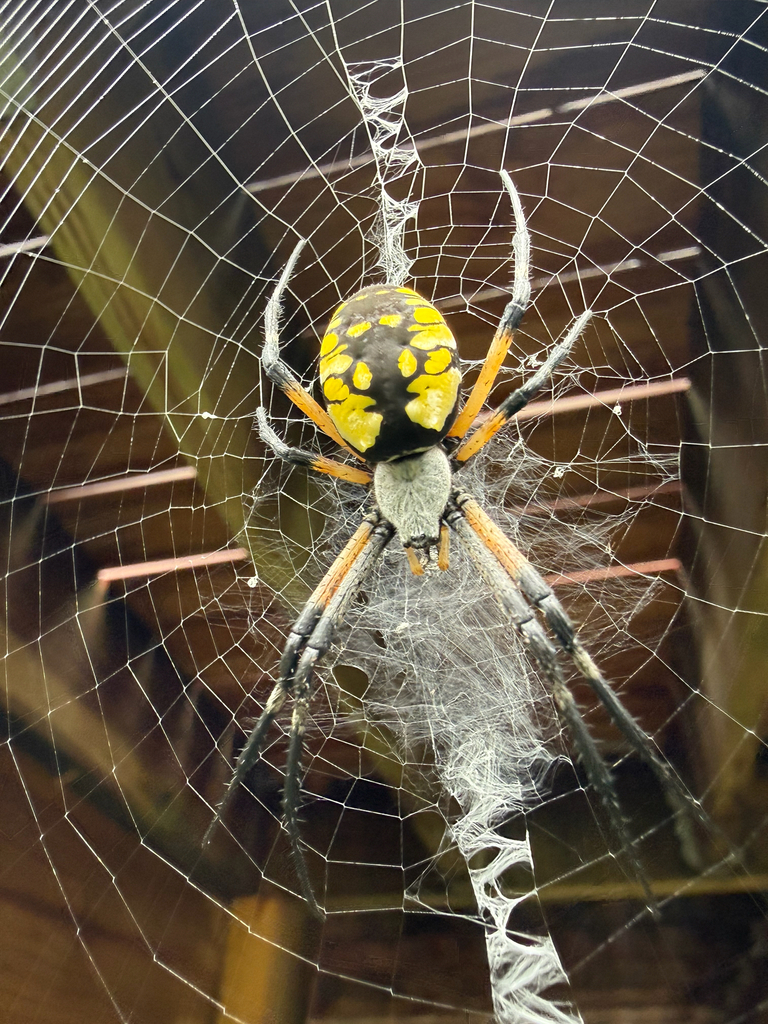 Hunting: The spider remains largely motionless in the center of its web, often head-down, waiting for prey—usually grasshoppers, flies, bees, and wasps—to become entangled in the sticky silk. Once prey is caught, the spider rapidly immobilizes it by wrapping it in silk before delivering a venomous bite.