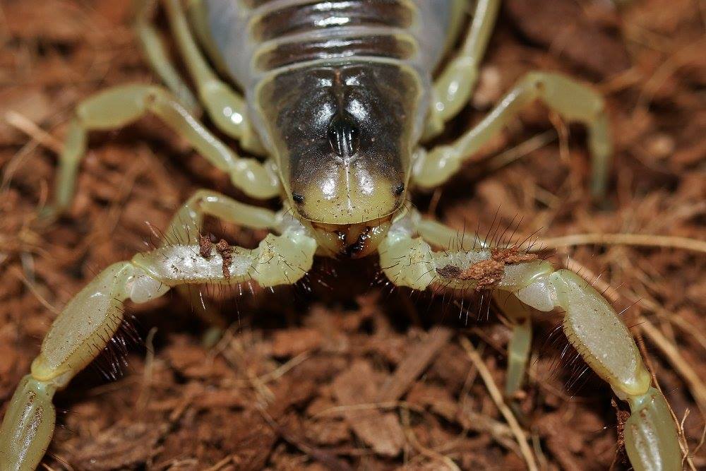 Regarding its temperament, the Giant Desert Hairy Scorpion is known for being defensive and territorial. When threatened, it would rather flee any danger. If it is unable to escape, it will readily adopt a defensive posture, arching its metasoma (tail) over its head and waving its pincers. While its venom is not considered medically significant or lethal to a healthy human, the sting is described as being roughly equivalent to that of a hornet, often resulting in localized pain, swelling, and redness.