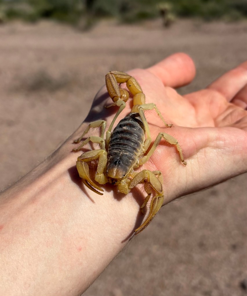 The most striking feature of the Giant Desert Hairy Scorpion is its impressive scale, with mature adults frequently reaching lengths of 5.5 to 7 inches (14–18 cm). Its body displays a distinct color palette consisting of a pale, straw-colored or yellowish exoskeleton, which is often contrasted by a dark, olive-toned “saddle” on the dorsal (top) side of its cephalothorax.