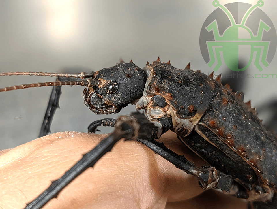 - Arming and Armor: Both sexes are wingless and covered in numerous small, sharp spines. The most striking feature, however, belongs to the male: a massive, curved spur located on the femur of the hind legs.
