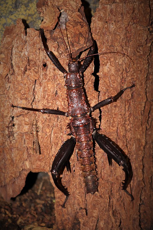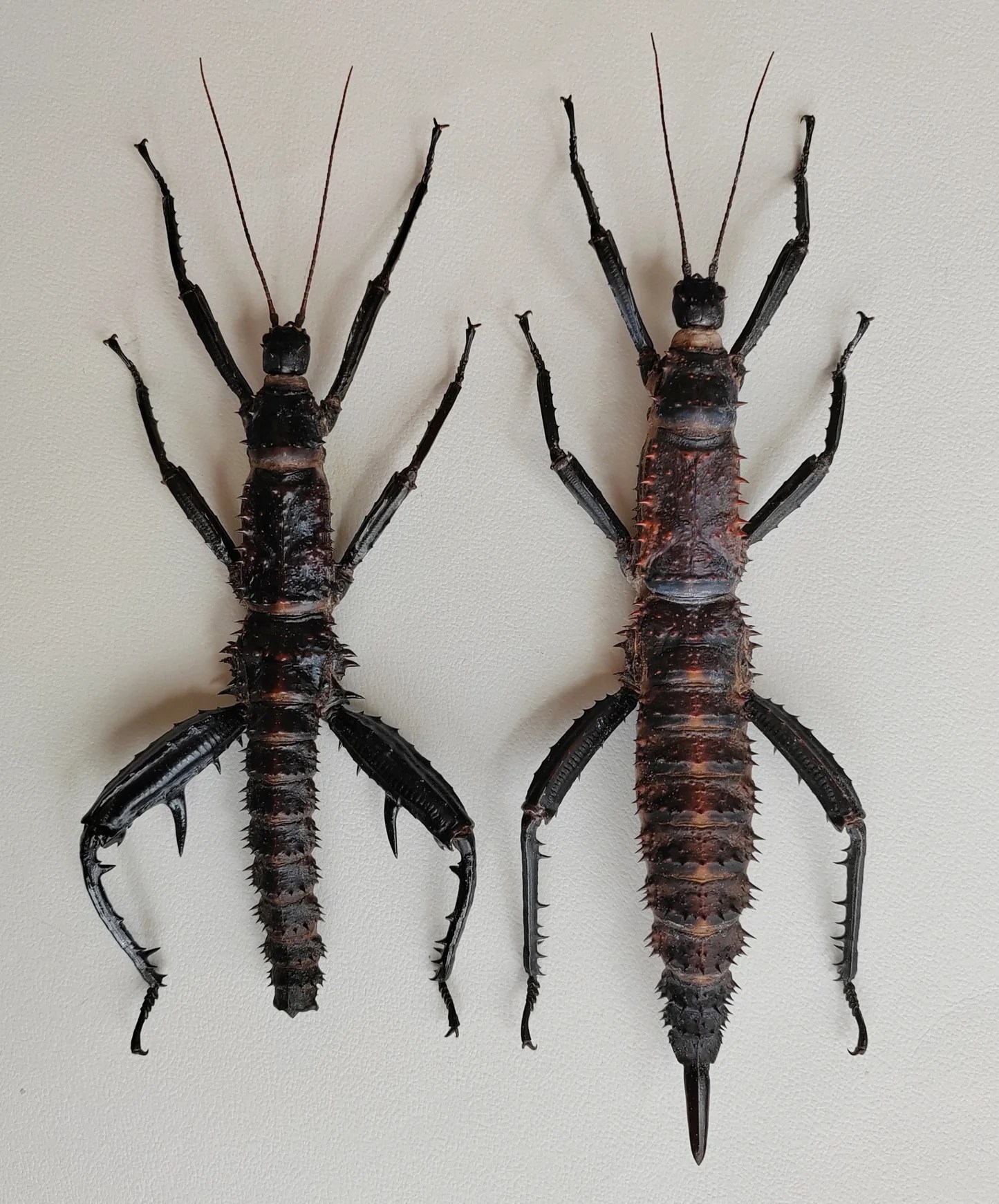 - Arming and Armor: Both sexes are wingless and covered in numerous small, sharp spines. The most striking feature, however, belongs to the male: a massive, curved spur located on the femur of the hind legs.