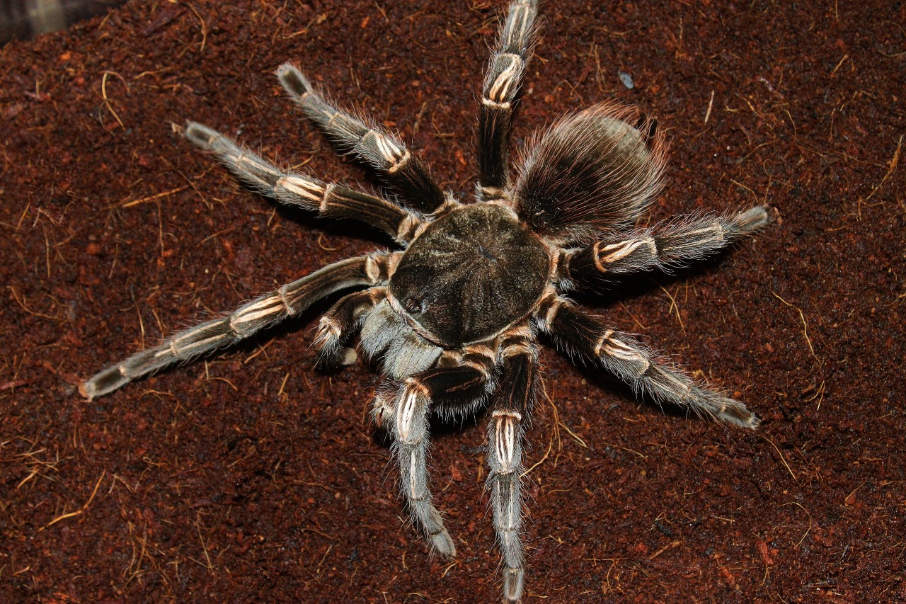 Lasiodorides striatus (pronounced Lah-sigh-oh-door-eye-dees stry-ate-us), also known as the Peruvian Orange-Stripe, is a hard to find species in the hobby. In the 90’s, when I got my female, these were often sold as Goliath Orange-Stripes on pet store dealer lists. This lead to some confusion in the pet trade as they were often purchased thinking they were actually Goliath Bird-Eating Tarantulas (Theraphosa blondi at the time). I was actually looking for a blondi and the owner of the mom and pop pet store that I went to said he could get them and this is what I ended up with. Though not a blondi it is still a very interesting and easy-to-keep species.